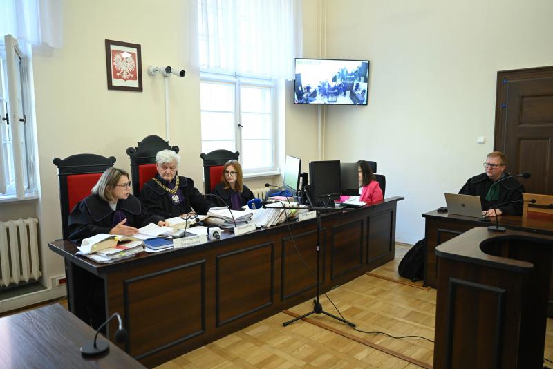 09.10.2025, Gdańsk (PAP) - Sędziowie: Dagmara Daraszkiewicz (L), Janusz Zimny (2L) i Edyta Frycz (3L) oraz obrońca byłego wicewojewody pomorskiego Krzysztofa Pusza Jacek Potulski (P) podczas pierwszej rozprawy odwoławczej w Sądzie Okręgowym w Gdańsku, 9 bm. Sprawa ma związek z 22 tys. ton sprowadzonej z Ukrainy skażonej ziemi przechowywanej w niewłaściwy, zagrażający środowisku sposób m.in. przez firmę Port Service. (fot. Adam Warżawa)