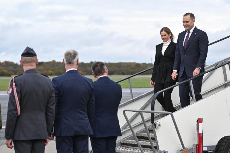 09.10.2025, Tallin (PAP) - Prezydent RP Karol Nawrocki (P) z małżonką Martą Nawrocką (2P) witani na lotnisku w Tallinnie, 9 bm. Prezydent Nawrocki rozpoczyna dwudniową wizytę w Estonii, w związku z udziałem w Spotkaniu Prezydentów Państw Grupy Arraiolos w Tallinnie. (fot. Radek Pietruszka)