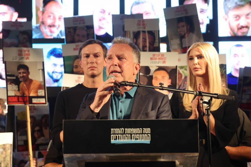 11.10.2025, Tel Aviv (PAP/EPA) - (L-R) Jared Kushner, son-in-law of US President Trump, Steve Witkoff, United States special envoy to the Middle East and special envoy for Peace Missions, Ivanka Trump, daughter of US President Trump, appear on stage during a rally at the so-called 'Hostages Square' outside the Kirya military headquarters in Tel Aviv, Israel, 11 October 2025. Tens of thousands are to gather at the "Hostages Square" ahead of the release of hostages held by Hamas. (fot. Abir Sultan)