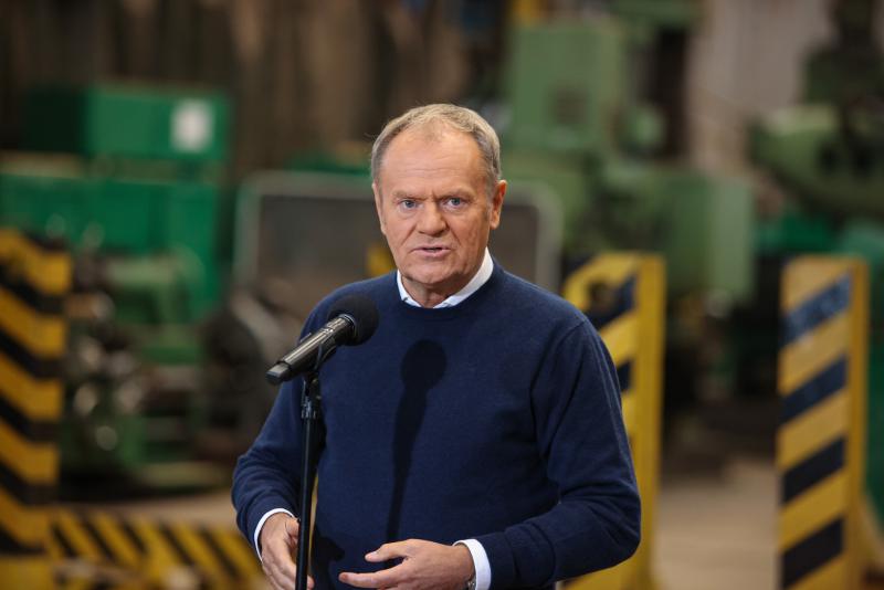 14.10.2025, Racibórz (PAP) - Premier Donald Tusk podczas wypowiedzi dla mediów w trakcie wizyty w firmie Raciborska Fabryka Komponentów w Raciborzu, 14 bm. RFK w Raciborzu to spółka utworzona przez Agencję Rozwoju Przemysłu S.A., Towarzystwo Finansowe "Silesia" oraz Polimex Mostostal w celu przejęcia aktywów upadającej spółki Rafako. (fot. Jarek Praszkiewicz)