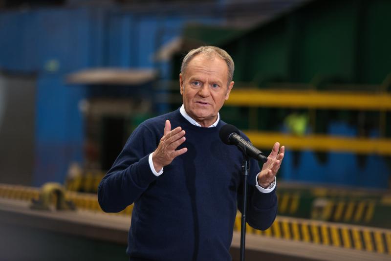 14.10.2025, Racibórz (PAP) - Premier Donald Tusk podczas wypowiedzi dla mediów w trakcie wizyty w firmie Raciborska Fabryka Komponentów w Raciborzu, 14 bm. RFK w Raciborzu to spółka utworzona przez Agencję Rozwoju Przemysłu S.A., Towarzystwo Finansowe "Silesia" oraz Polimex Mostostal w celu przejęcia aktywów upadającej spółki Rafako. (fot. Jarek Praszkiewicz)