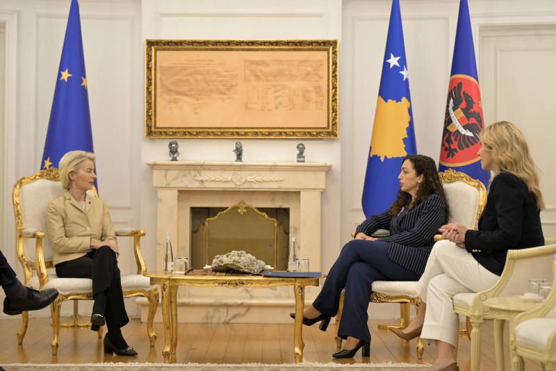 15.10.2025, Pristina (PAP/EPA) - President of Kosovo Vjosa Osmani (C) and European Commission President Ursula von der Leyen (L) talk during their meeting in Pristina, Kosovo, 15 October 2025. Von der Leyen is in Kosovo as part of her tour of Western Balkan countries. (fot. Visar Kryeziu)