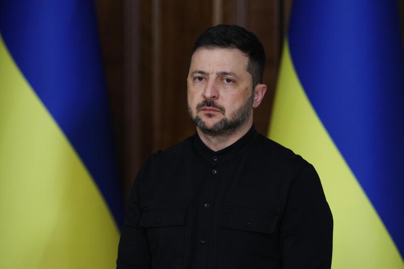 10.10.2025, Kijów (PAP) - Prezydent Ukrainy Wołodymyr Zełenski podczas konferencji prasowej w Kijowie, 10 bm. Prezydent przekazał, że siły rosyjskie użyły w nocy z 9 na 10 bm. 450 dronów i ponad 30 rakiet, atak był wymierzony w obiekty infrastruktury krytycznej. Nocne bombardowanie ukraińskiej infrastruktury krytycznej przez wojska rosyjskie spowodowało tymczasowe odcięcie dostaw wody dla 2 milionów odbiorców w Kijowie. (fot. Victor Kovalchuk)