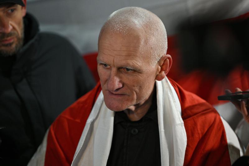 13.12.2025, Wilno (PAP) - Białoruski działacz społeczny, polityk, obrońca praw człowieka i więzień polityczny Aleś Bialacki przed Ambasadą Amerykańską w Wilnie, 13 bm. Białoruś uwolniła 123 więźniów politycznych z różnych państw w ramach umowy z USA. (fot. Valdemar Doveiko)