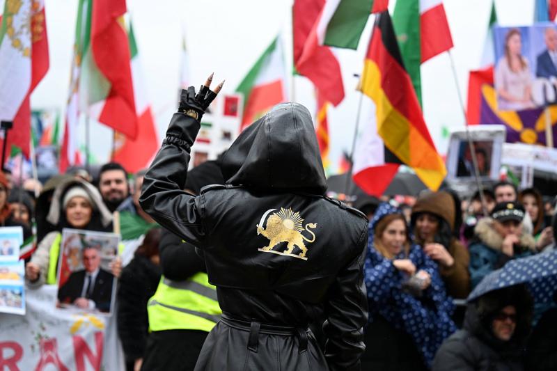 14.02.2026, Munich (PAP/EPA) - A demonstrator flashes the victory sign during a rally to denounce the Iranian government's crackdown on recent protests and calling for regime change in Iran, in Munich, Germany, 14 February 2026. The rally, part of a 'Global Day of Action' called by exiled Iranian Crown Prince Reza Pahlavi, coincides with the 62nd Munich Security Conference. (fot. Fariha Farooqui)