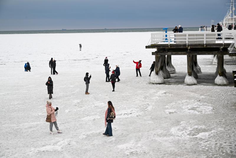 08.02.2026, Sopot (PAP) - Skuty lodem Bałtyk w Sopocie, 8 bm. Morze Bałtyckie zamarzło przy linii brzegowej. Mimo ostrzeżeń straży miejskiej, mieszkańcy i turyści spacerują po lodowej tafli. (fot. Andrzej Jackowski)