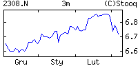 | | | Zmiana | +0.02 (+0.30%) | | Max/min | 6.69 / 6.69 | | Zmiana 52t | -0.34 (-4.84%) | | Max/min 52t | 7.04 / 6.56 |